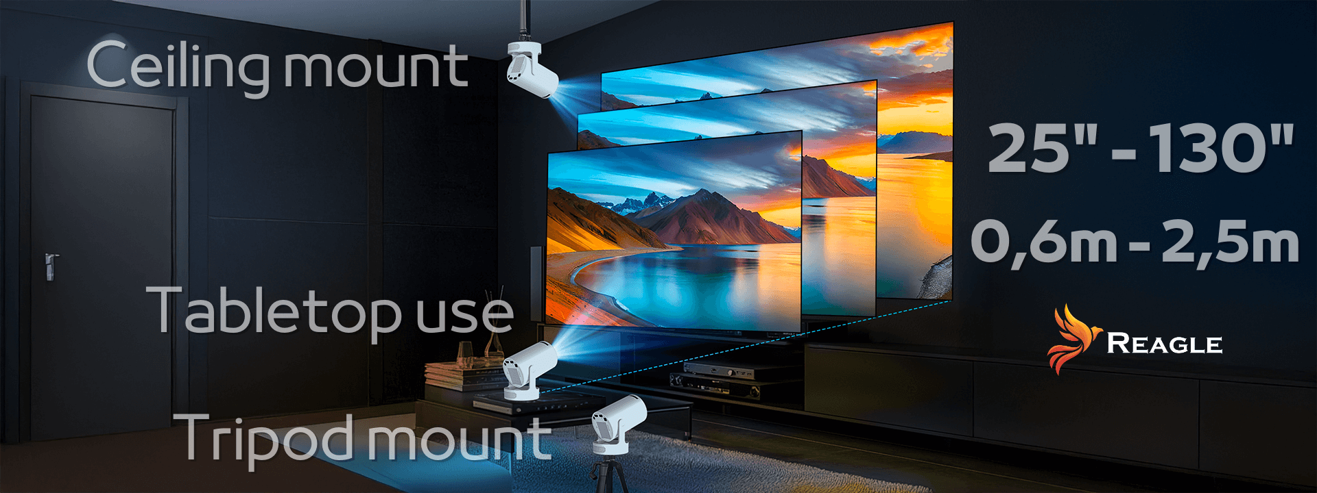 Durch die180°-Drehung können Sie den Projektor auf einem Tisch, an der Decke oder seitlich aufstellen - das Bild ist immer perfekt ausgerichtet.