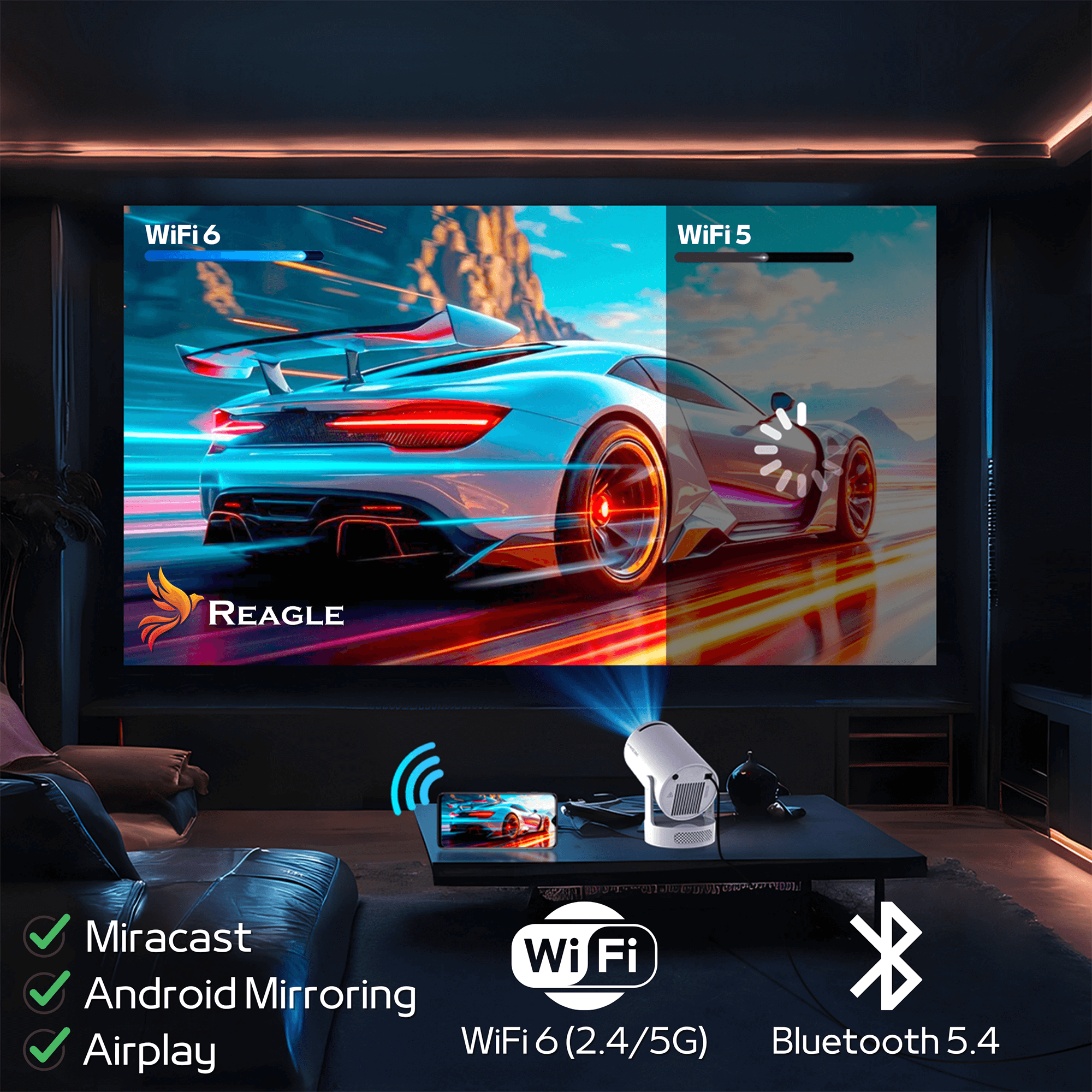 Er funktioniert mit jedem Gerät, das mit der drahtlosen Bildübertragungsfunktion ausgestattet ist. Verbinden Sie Ihr Gerät, z. B. Ihr Telefon, einfach mit demselben Wi-Fi-Netzwerk wie den Projektor und genießen Sie die große Leinwand ohne Kabelsalat.