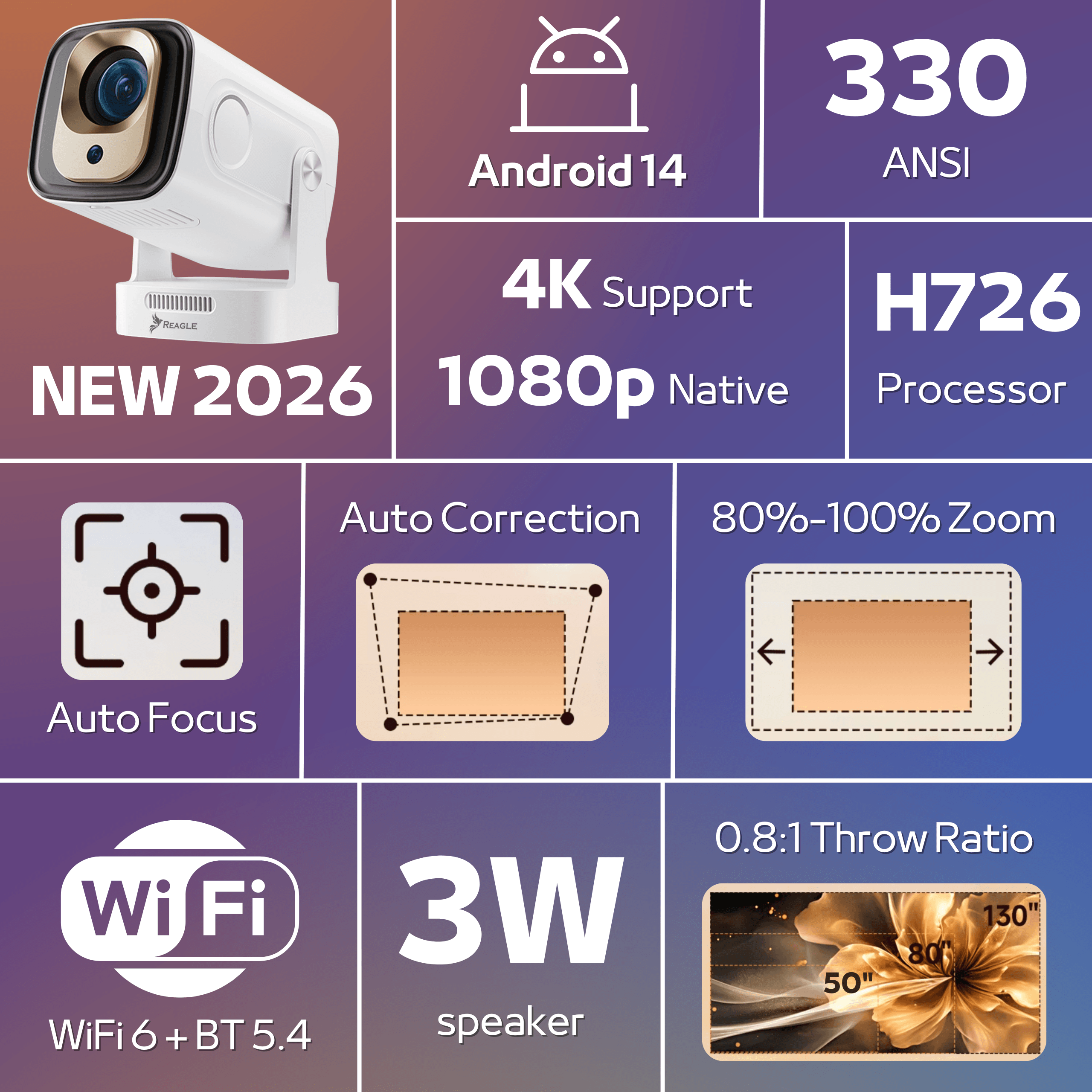 - Automatischer Keystone-Modus: Das Bild ist immer rechtwinklig, auch wenn der Projektor nicht perfekt vor der Leinwand steht