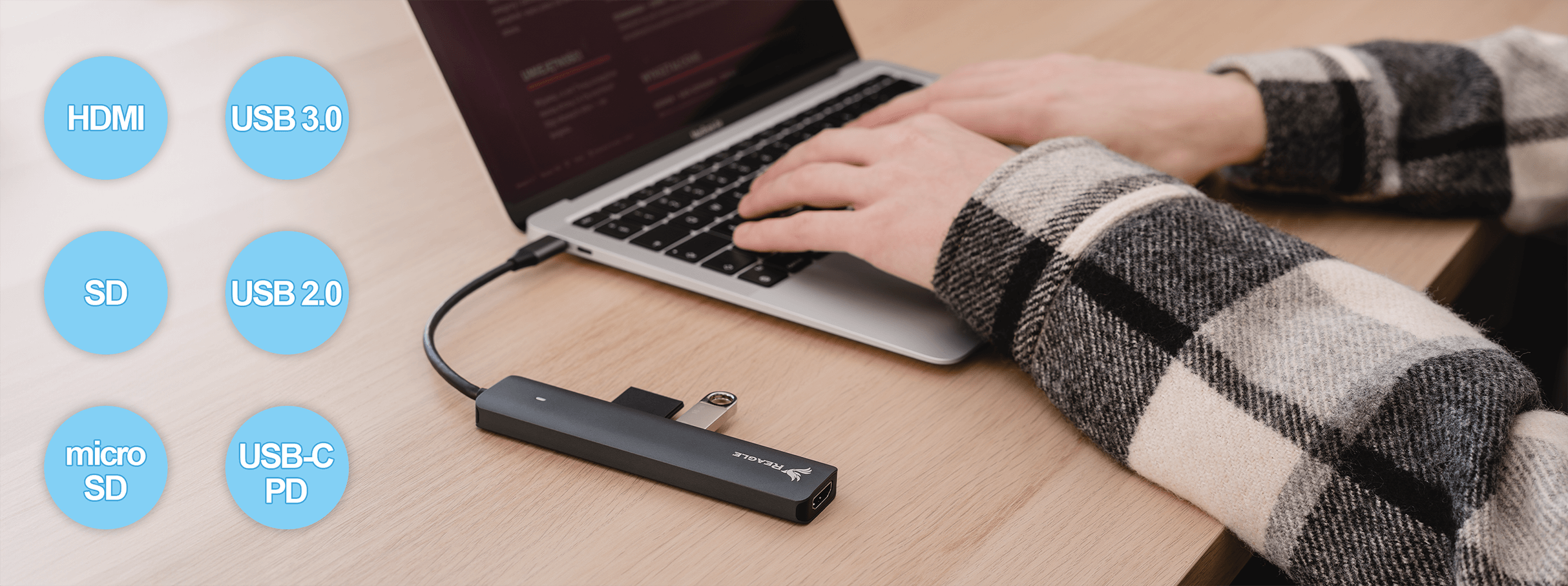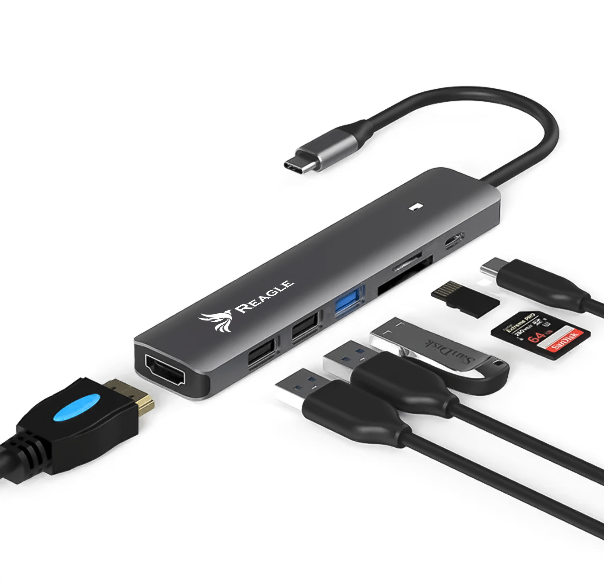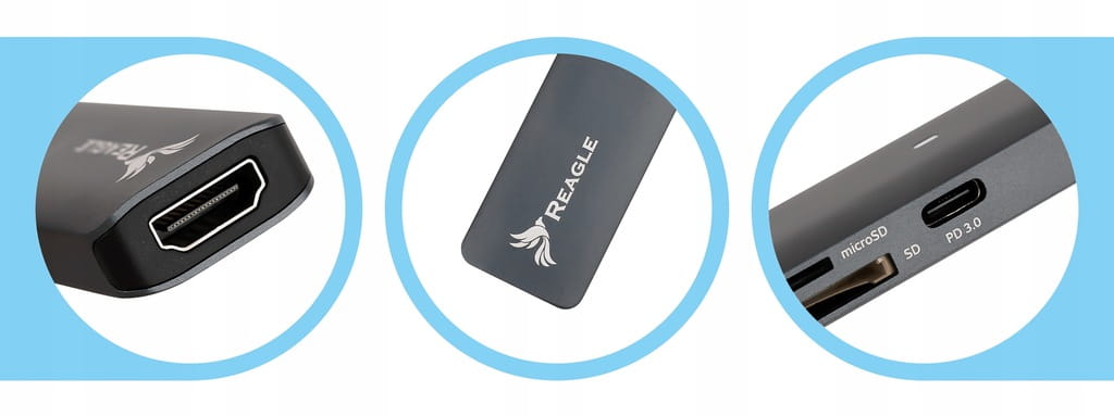 Der RHUB63C USB-C-Hub von Reagle ist die Antwort auf die Bedürfnisse der heutigen Nutzer, die mehr von ihren oft anschlussarmen Geräten erwarten. Er verfügt über einen HDMI 2.0-Anschluss zum Anschließen eines Monitors oder Fernsehers in 4K-Qualität für ein außergewöhnliches visuelles Erlebnis. Der integrierte SD- und Micro-SD-Kartenleser erspart Ihnen zusätzliches externes Zubehör.