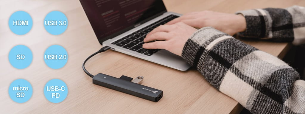 Der RHUB63C von Reagle ist ein multifunktionaler USB-C 3.2 Gen 1 Aktiv-Hub mit HDMI-Port, 100W PD und Kartenleser.