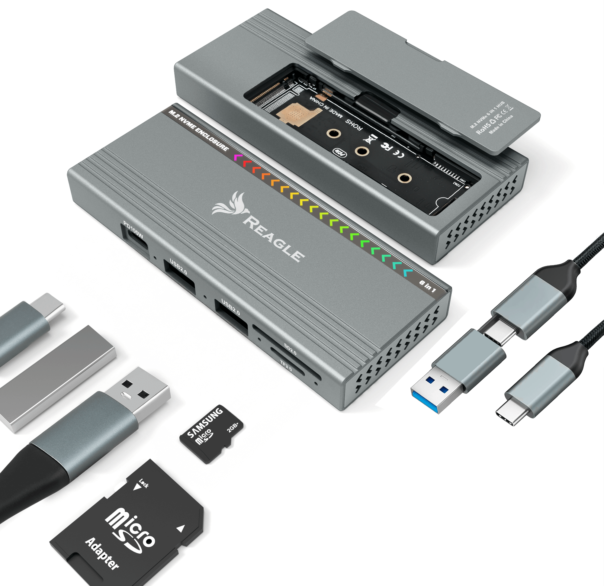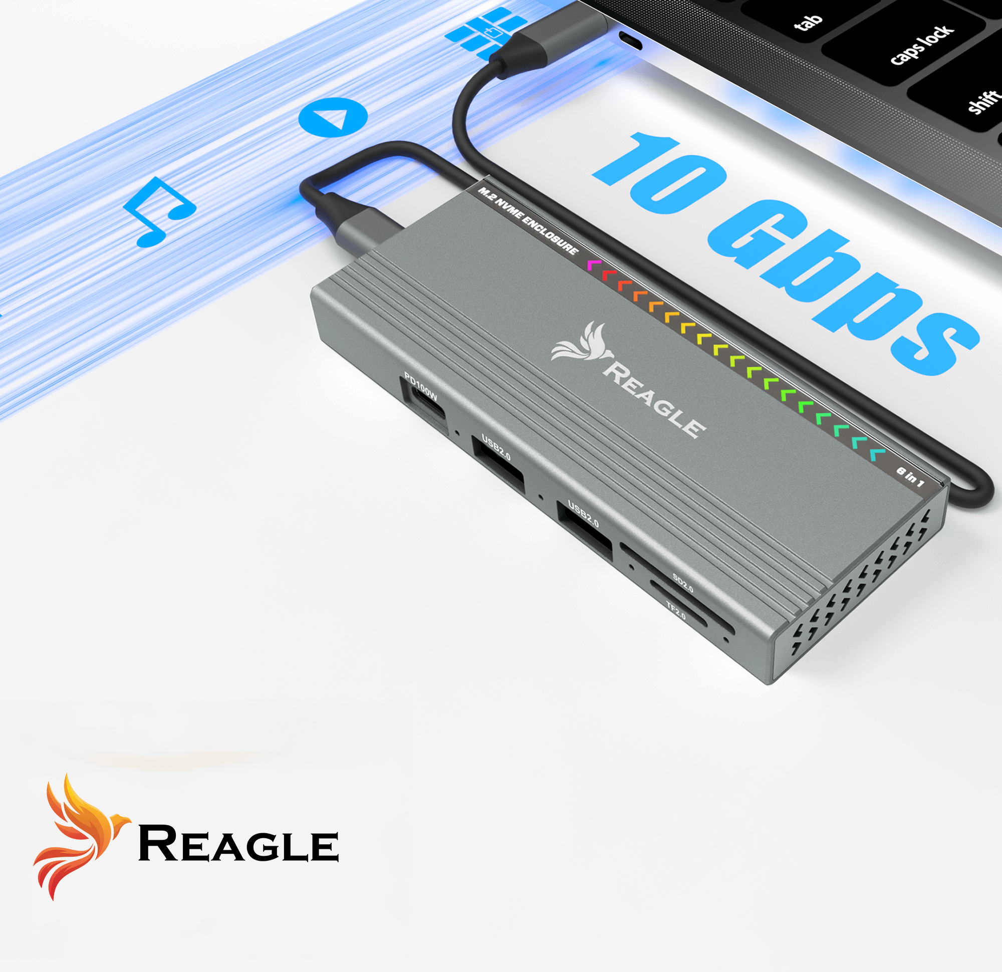 Der Reagle RHUB73AC ist ein multifunktionaler USB 3.2 Gen 2-Hub mit Platz für ein M.2 NVMe- oder herkömmliches SATA NGFF-Laufwerk, 100W Power Delivery und Kartenleser.
