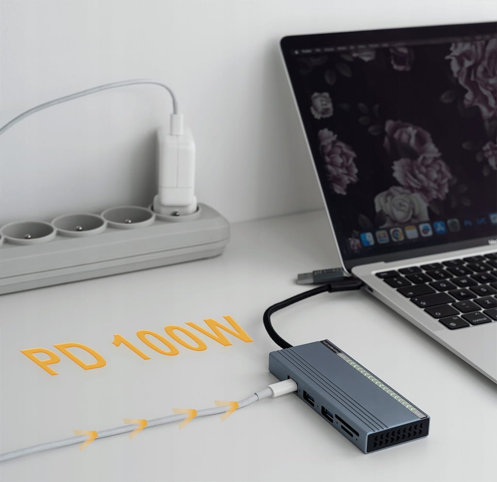 Der Hub unterstützt dank des USB 3.2 Gen 2-Standards eine maximale Datenübertragungsrate von bis zu 10 Gbit/s. Mit dieser Übertragungsrate wird Ihre Arbeit im Vergleich zu früheren USB-Standards viel schneller und effizienter sein. Der USB-C-Anschluss mit 100 W Power Delivery ermöglicht es Ihnen, selbst die anspruchsvollsten Geräte aufzuladen, während die volle Leistung der anderen Anschlüsse erhalten bleibt. Die Plug-and-Play-Technologie erspart Ihnen die lästige Installation von Treibern - einfach den Hub einstecken und schon funktioniert er! Er ist mit Windows, Mac OS und Android kompatibel, sodass Sie auch über mobile Geräte Dateien durchsuchen und übertragen können.