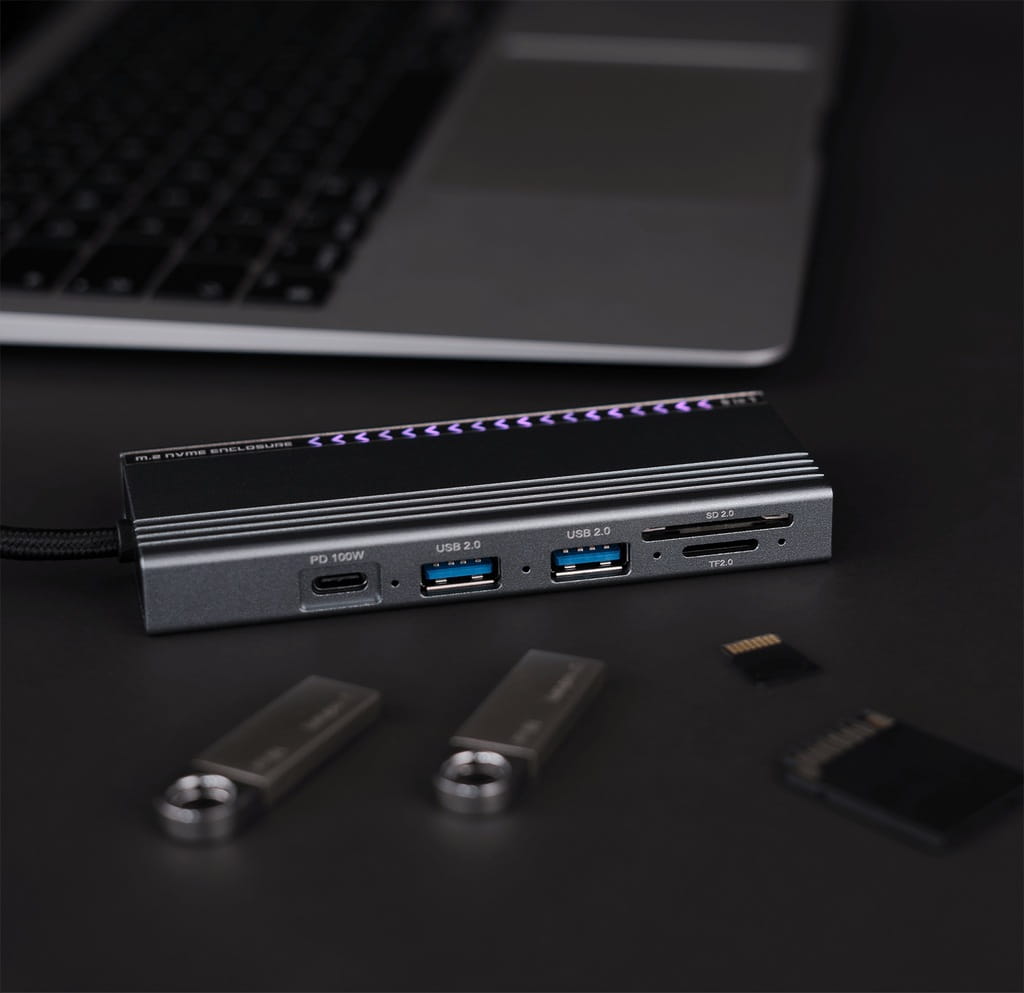 - Ports: 1 x NVMe, 1 x USB-C PD, 2 x USB-A 2.0, 1 x SD, 1 x micro SD