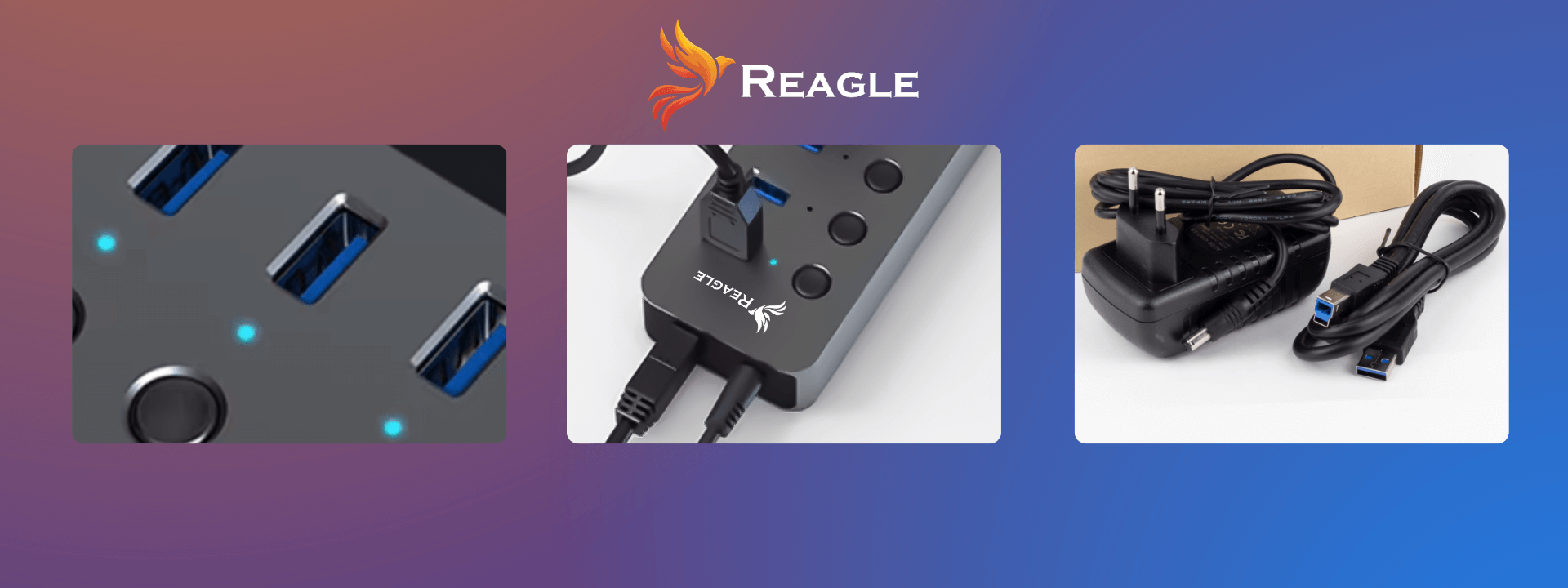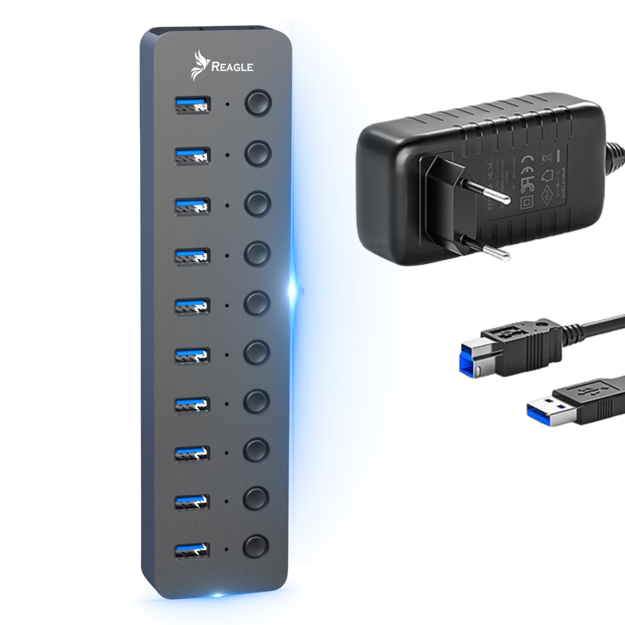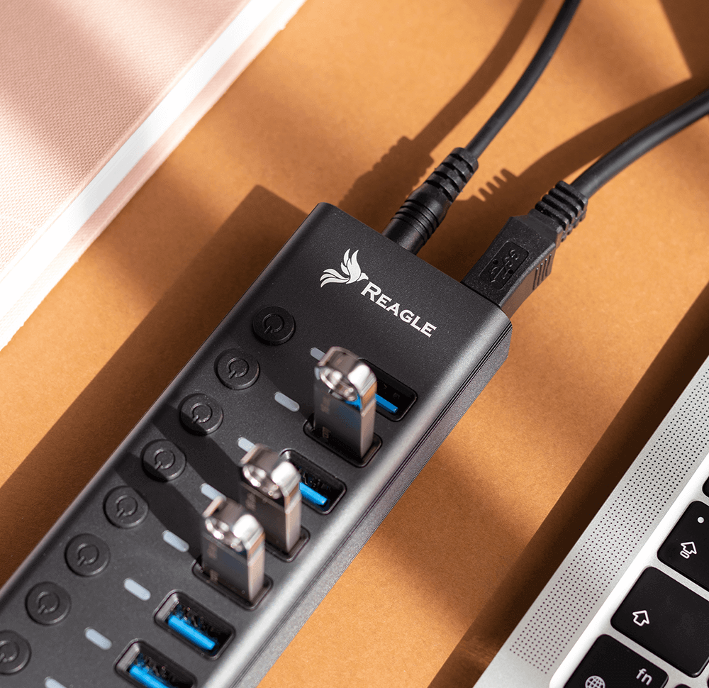 Die Produkte von Reagle zeichnen sich durch eine hervorragende Verarbeitungsqualität aus. Das Aluminiumgehäuse des Hubs schützt ihn effektiv vor mechanischen Beschädigungen. Er verfügt über LEDs an jedem Anschluss, die den Betrieb des Geräts anzeigen. Sie brauchen kein spezielles Netzteil zu kaufen, da es bereits im Set enthalten ist.