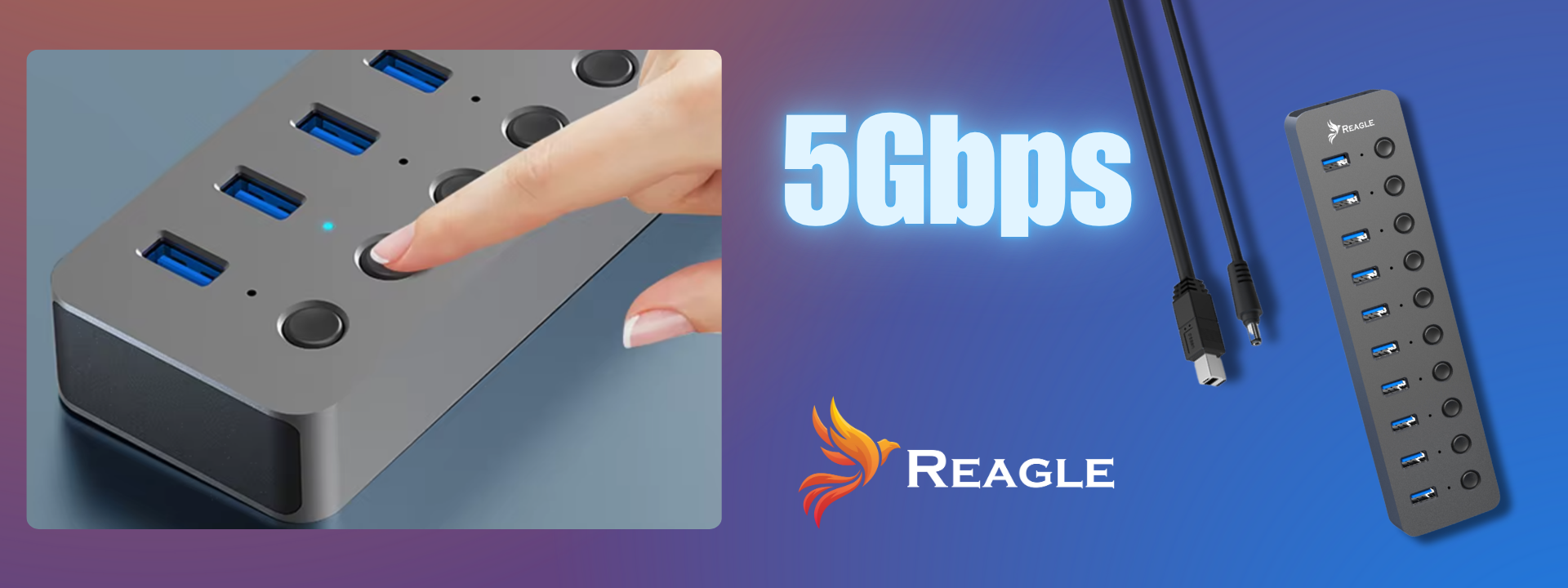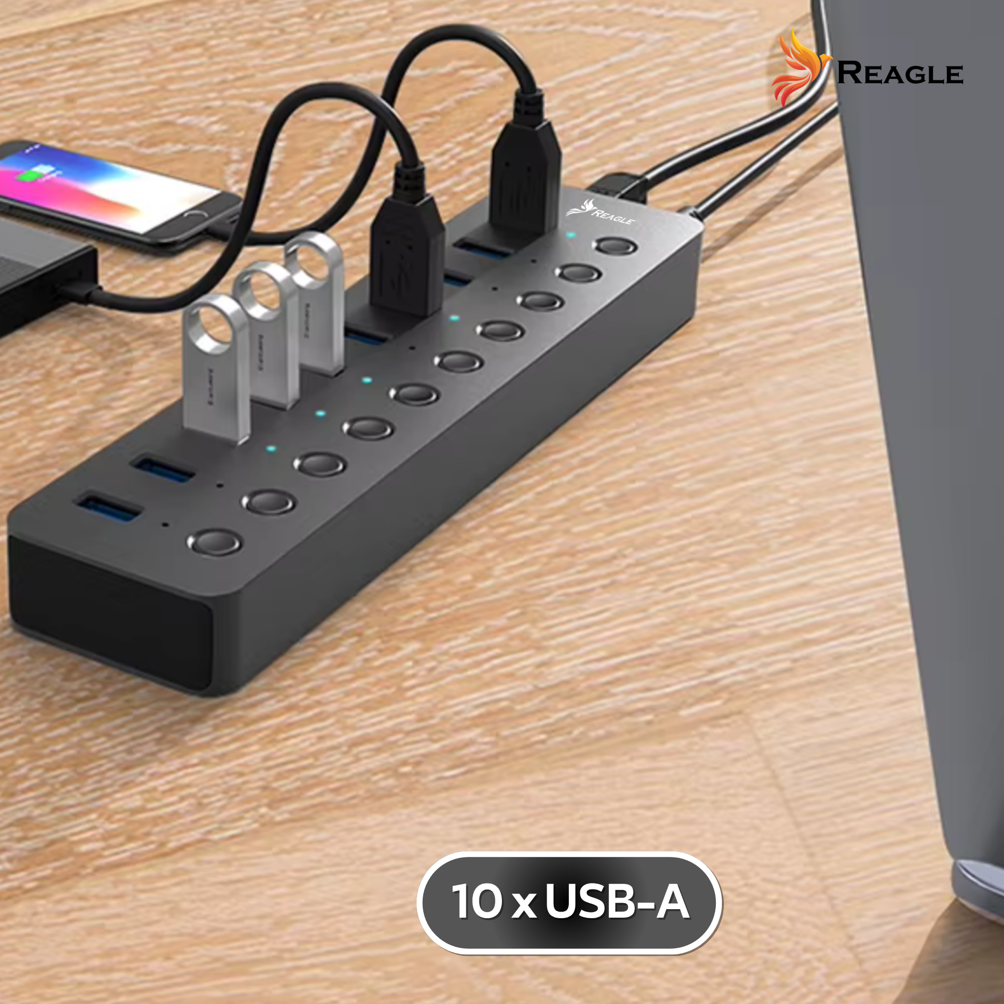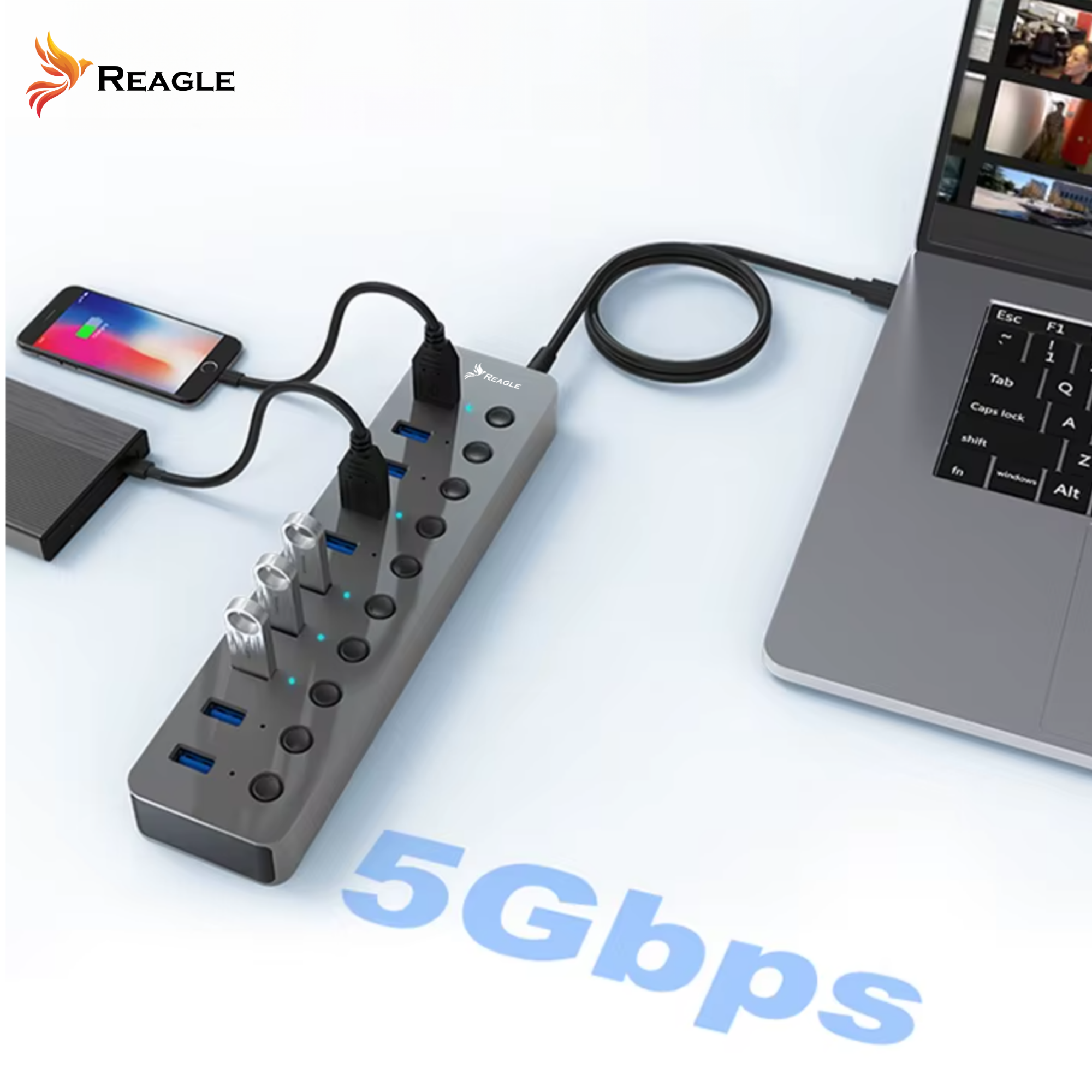 Der RHUB73A der Marke Reagle ist ein aktiver USB-A 3.2 Gen 1 Hub mit Ladefunktion.
