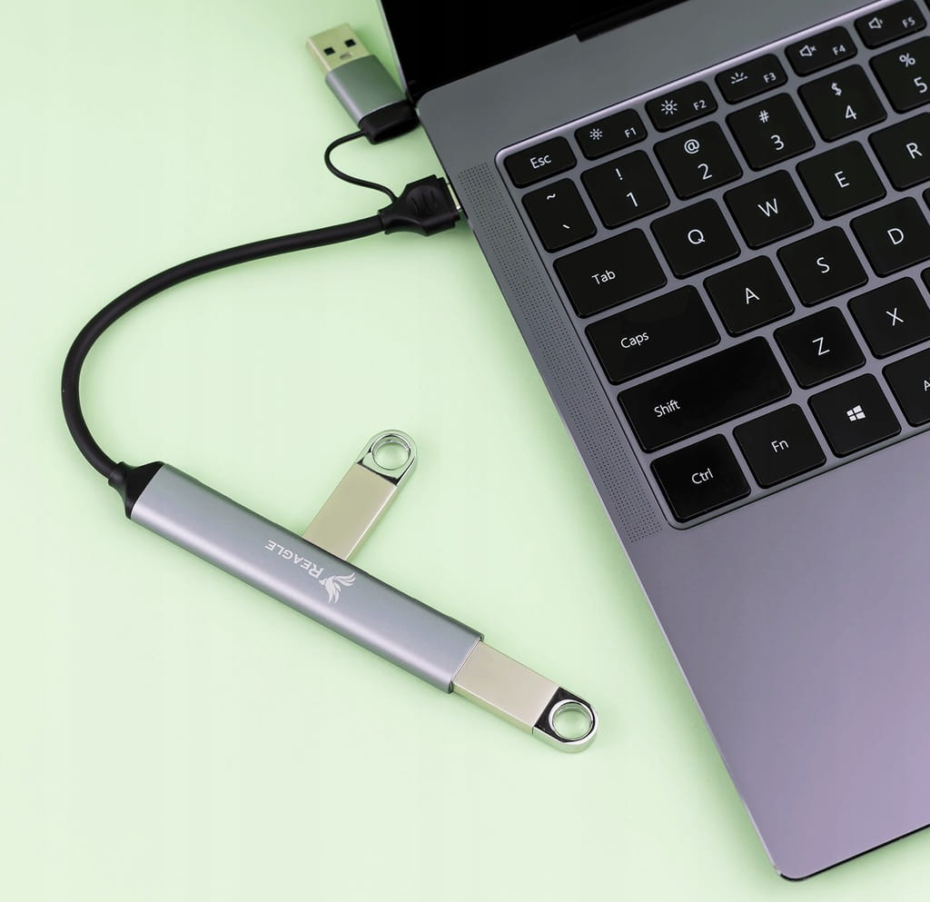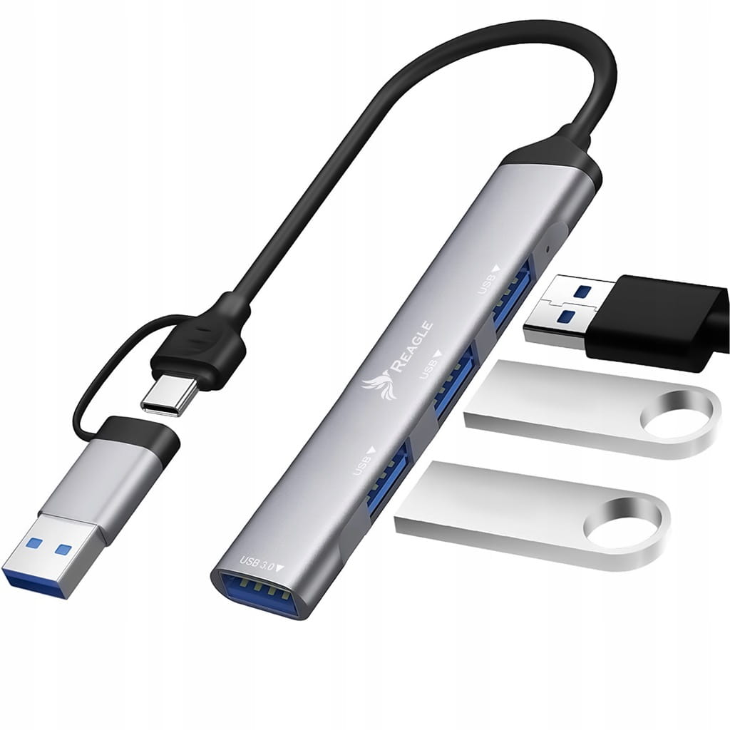 Der RHUB32AC-Hub von Reagle ist eine großartige Ergänzung für moderne Geräte, die nicht über genügend Anschlüsse verfügen. Er verfügt über einen dualen USB-Stecker, sodass Sie den Hub sowohl an den USB-A-Anschluss Ihres Laptops als auch an den USB-C-Anschluss Ihres Telefons anschließen können. Sie können vier zusätzliche USB-A-Geräte anschließen, z. B. eine Maus, einen Speicherstick oder eine Festplatte. Dank dieses Hubs werden Sie das Problem der unzureichenden Anschlüsse an Ihren mobilen Geräten vergessen.