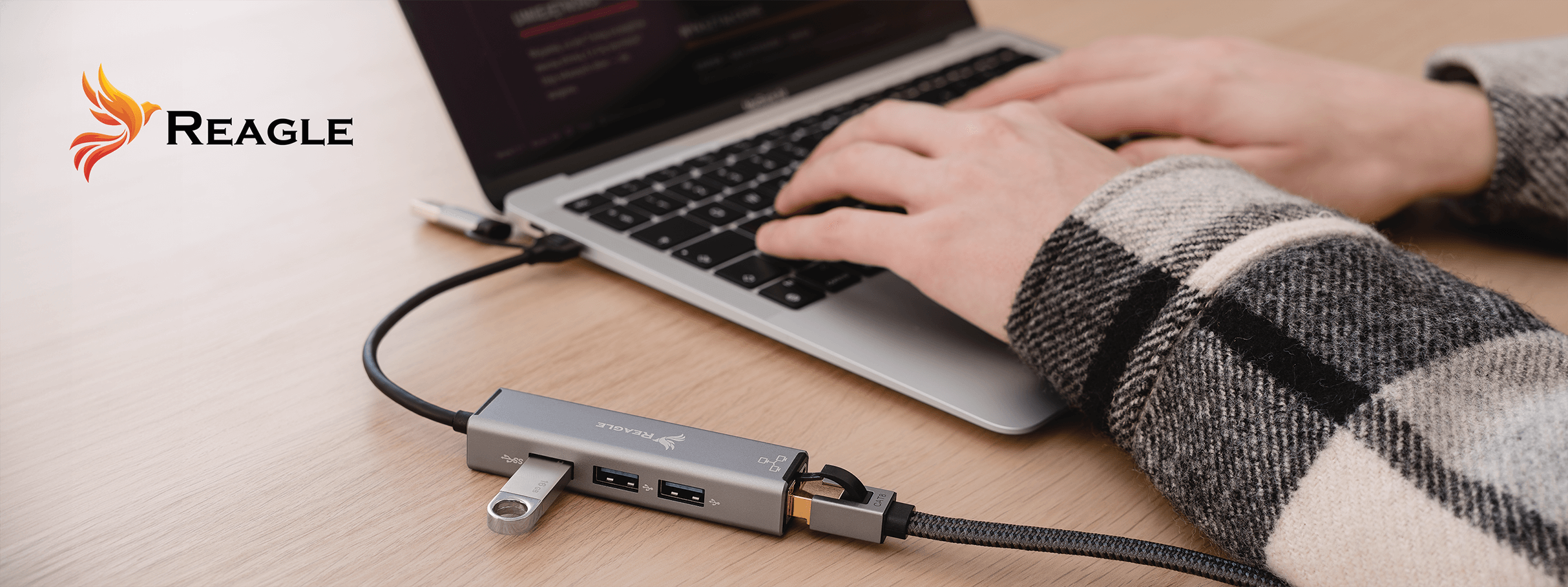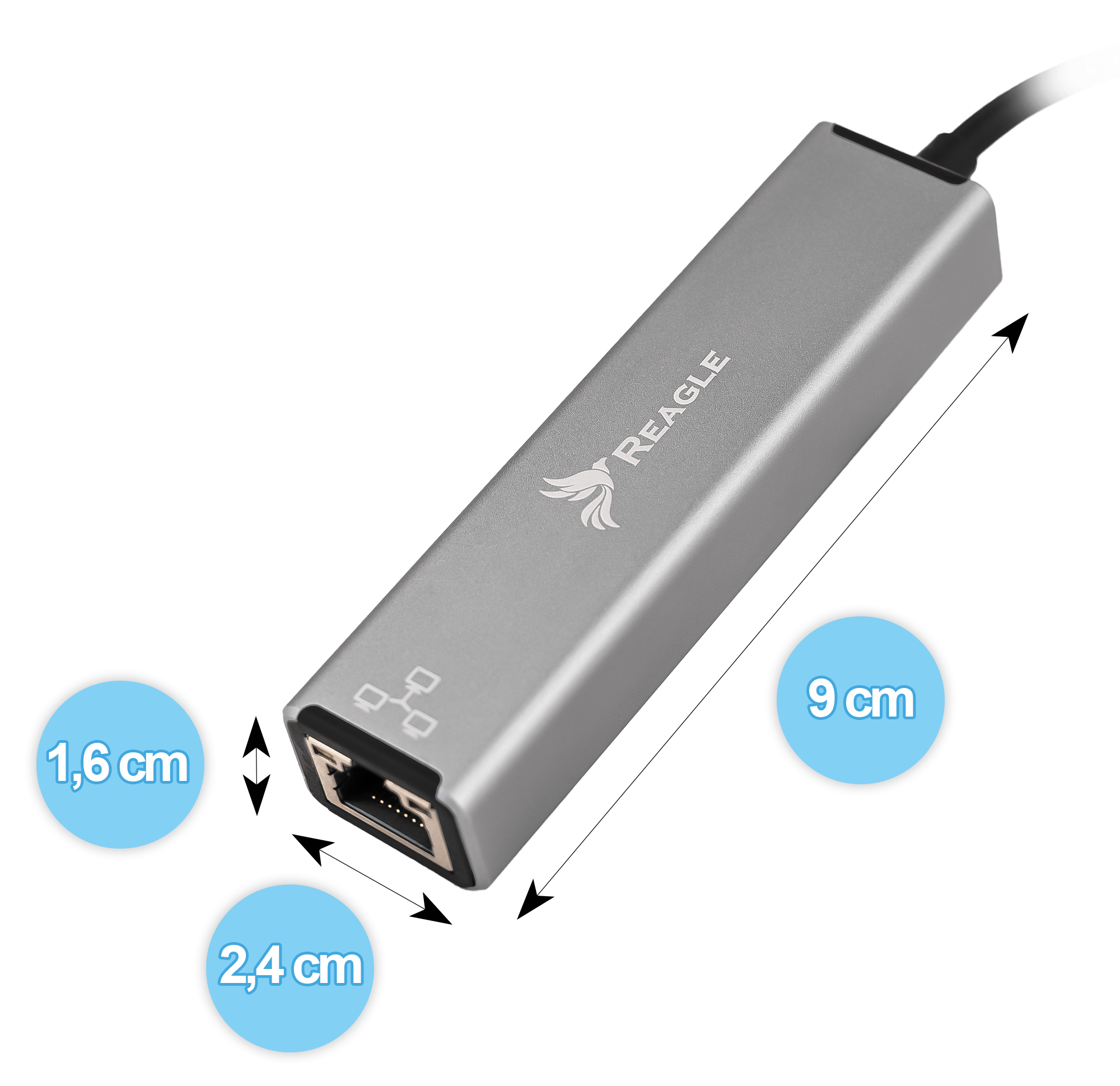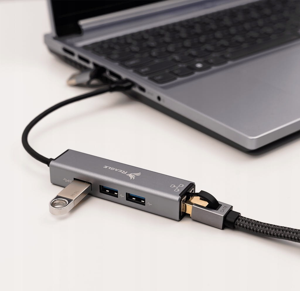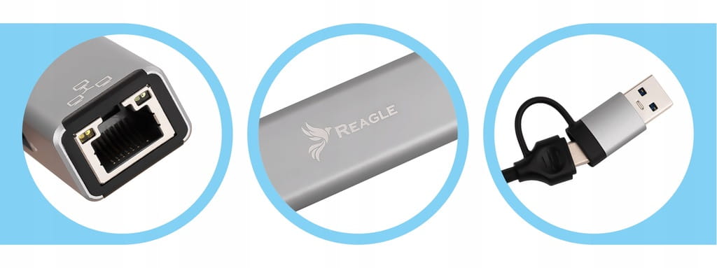 RYACRJ7 od marki Reagle to uniwersalna karta sieciowa z dwoma wtykami oraz trzema portami USB-A.