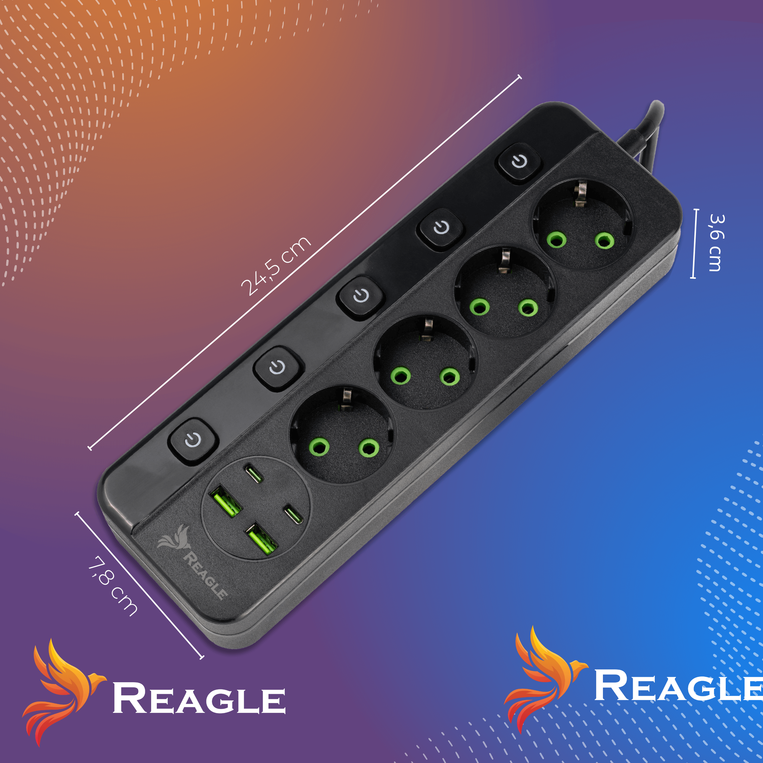 PRZEDŁUŻACZ LISTWA ZASILAJĄCA 3M ANTYPRZEPIĘCIOWA 4 GNIAZDA 2x USB 2x USB-C REAGLE