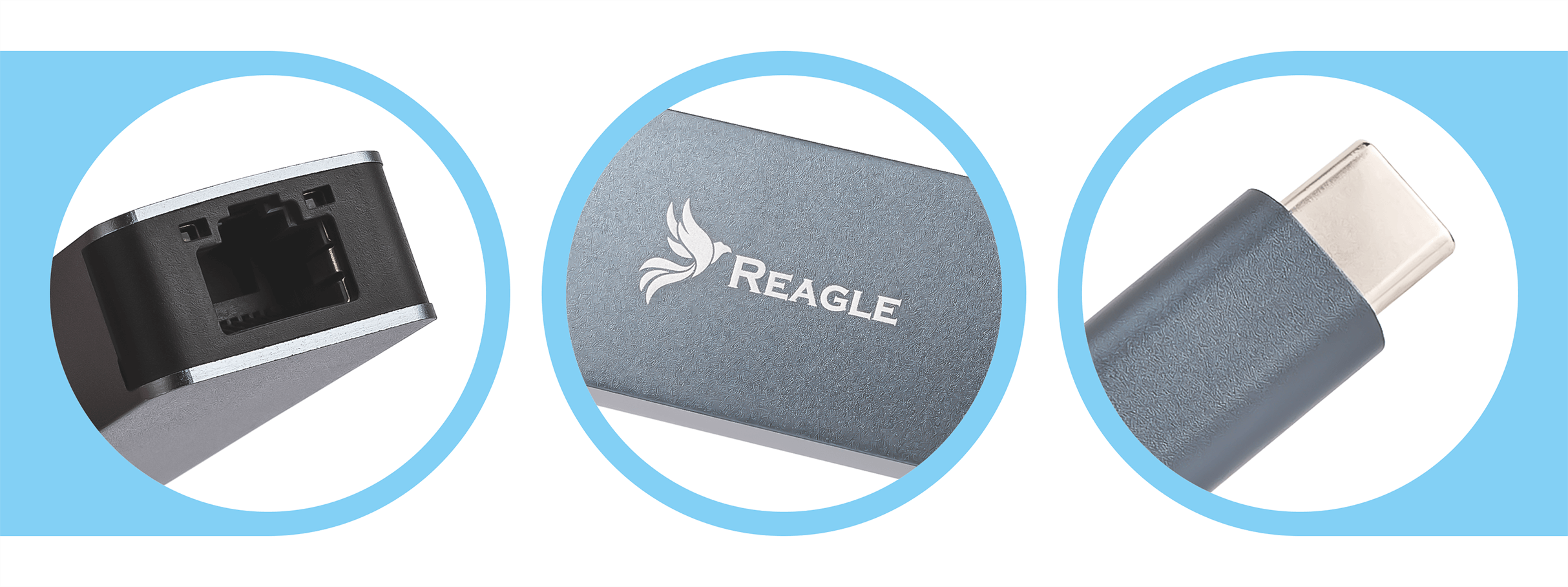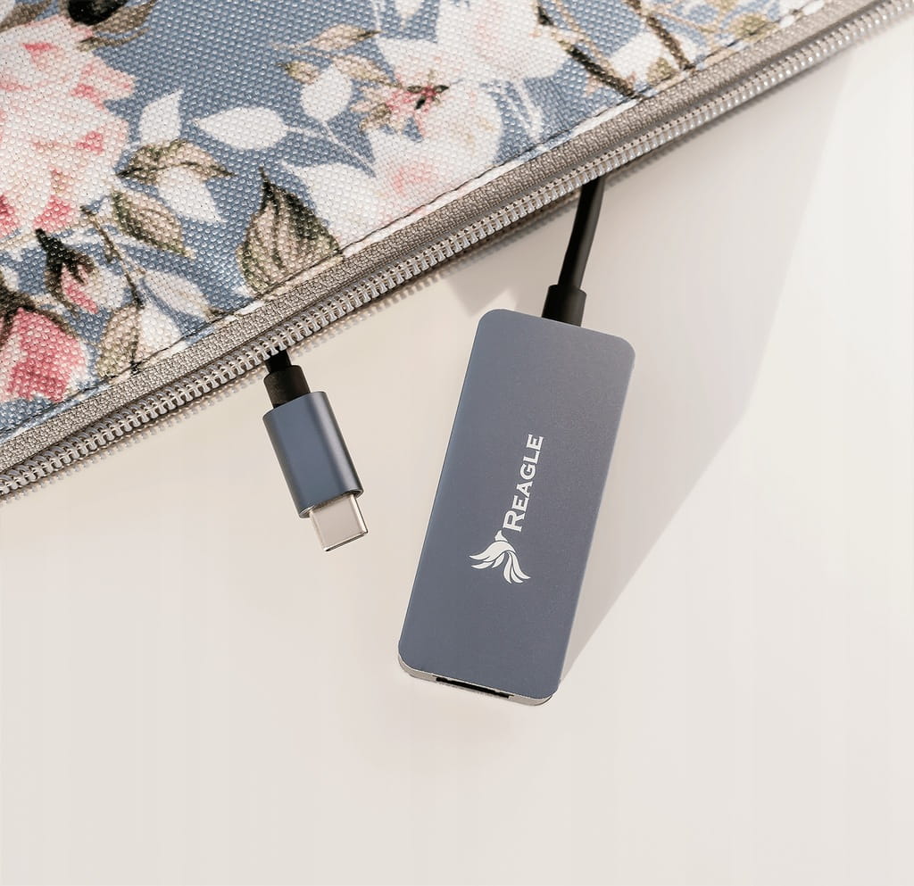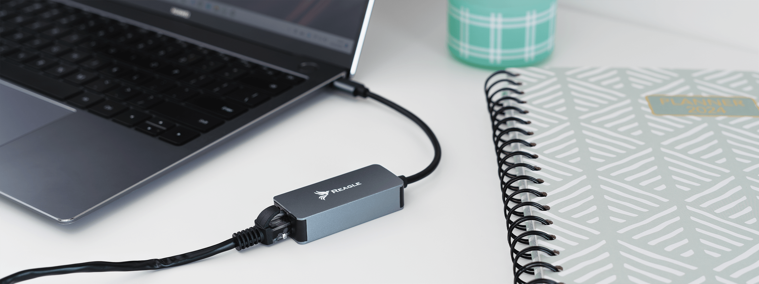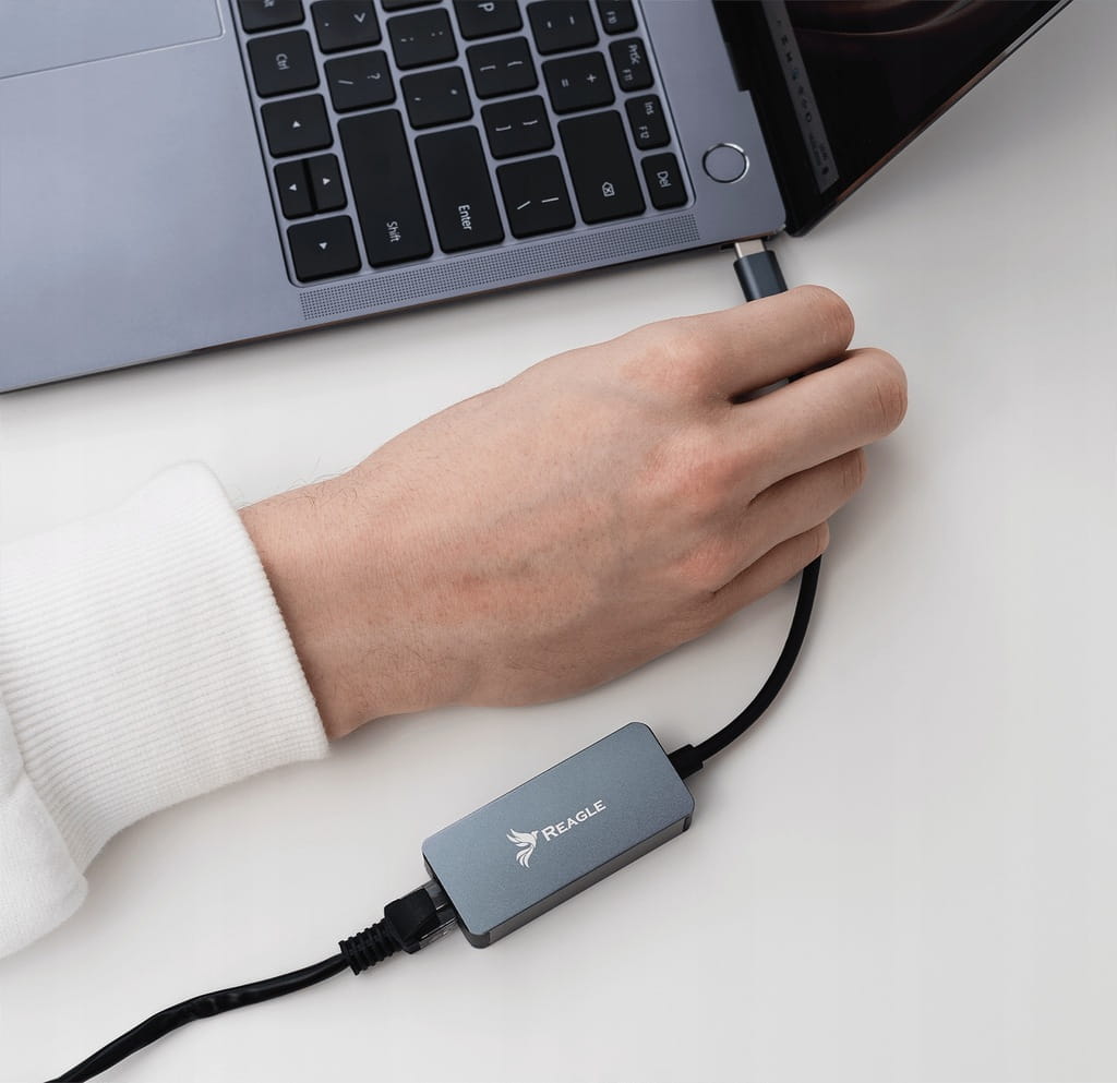 RYCRJ7 od marki Reagle to karta sieciowa o przepustowości do 2,5G umożliwiająca podłączenie przewodu Ethernet do portu USB-C.