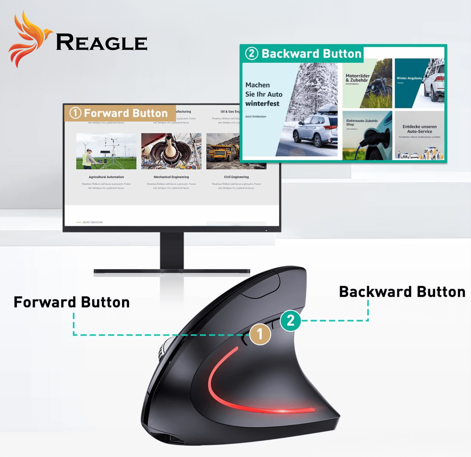 Pionowa optyczna mysz bezprzewodowa od Reagle została wyposażona w dodatkowe przyciski boczne, umożliwiające szybkie przełączanie stron w przeglądarce oraz sprawniejszą nawigację po dokumentach. Dzięki temu praca staje się bardziej intuicyjna i efektywna.