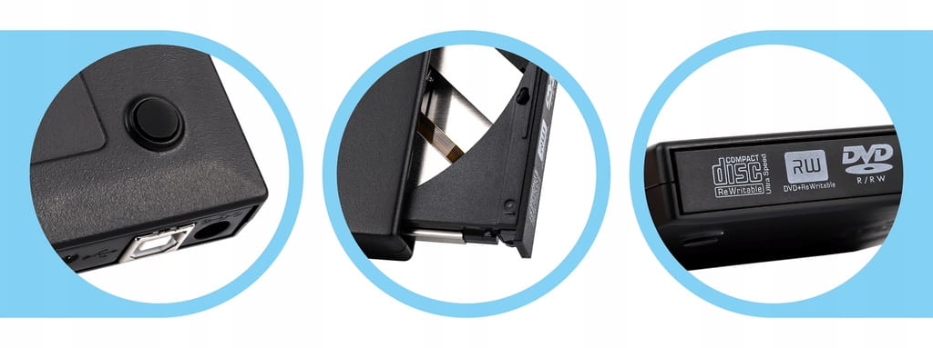 - W zestawie: 1 x napęd płyt, 1 x instrukcja obsługi, 1 x przewód USB-A - USB-B, 1 x przewód USB-A - DC