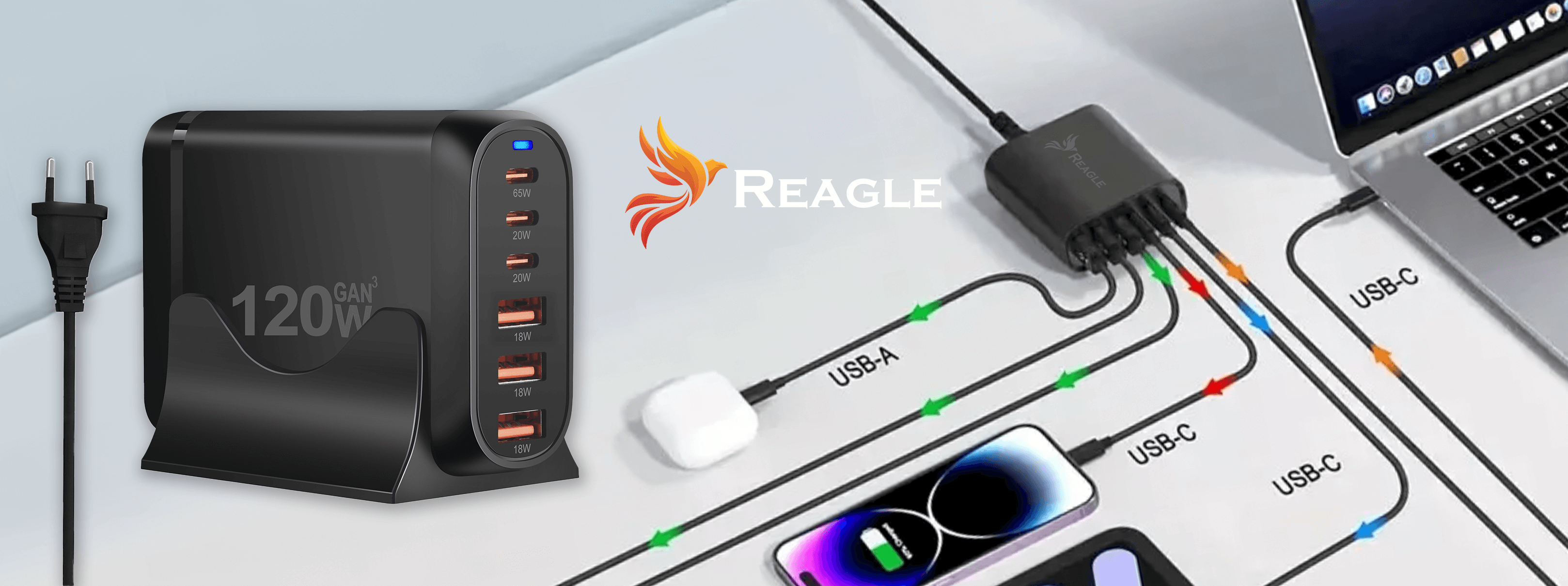 Reagle Szybka Ładowarka GaN 120W PD 3x USB C 3x Qc 3.0 Do Laptopa Iphone 65W Mac