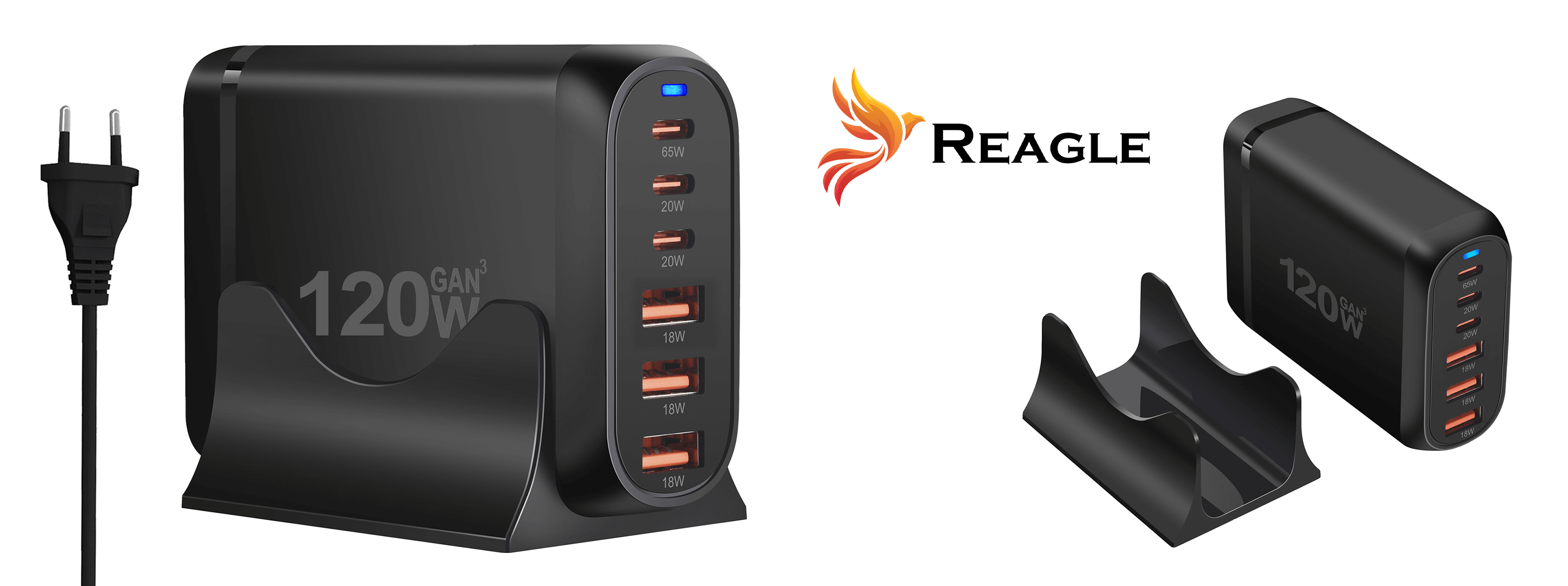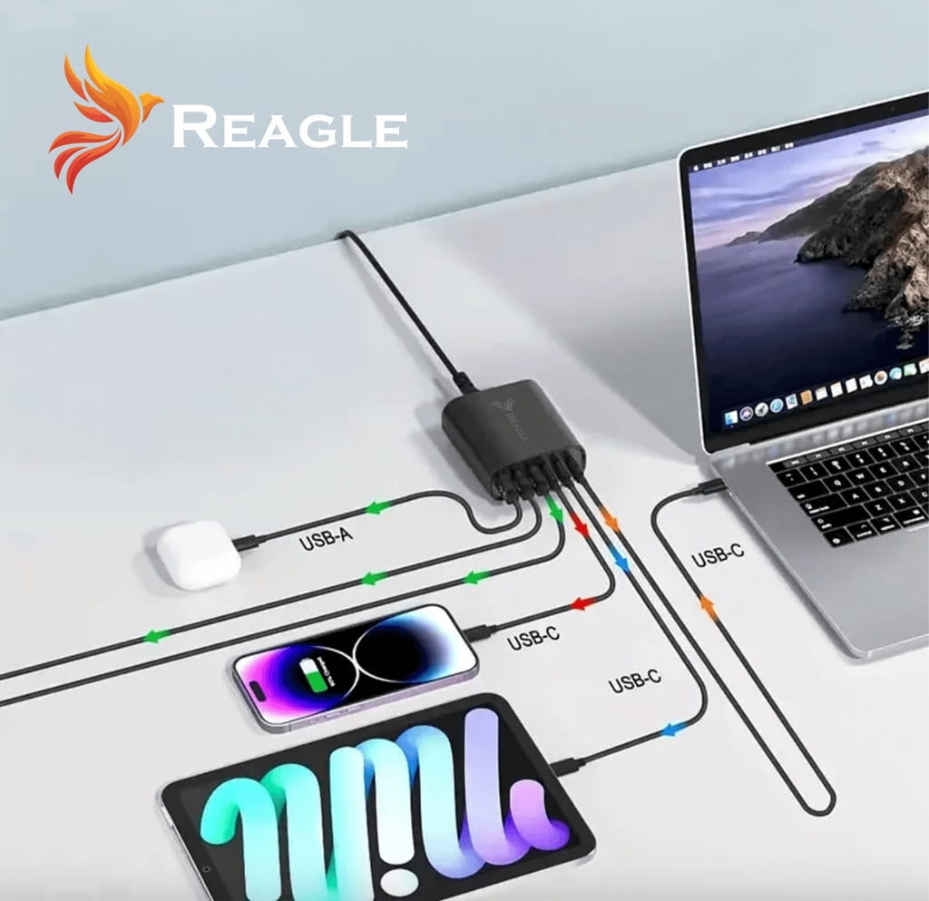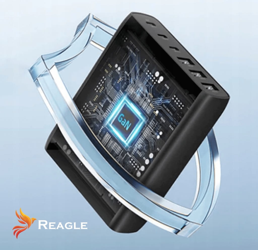 Reagle RCHAR82 to ładowarka sieciowa GaN o łącznej mocy 120W z trzema portami USB-C i trzema USB-A w zestawie z podstawką i zasilaczem 2.5A.