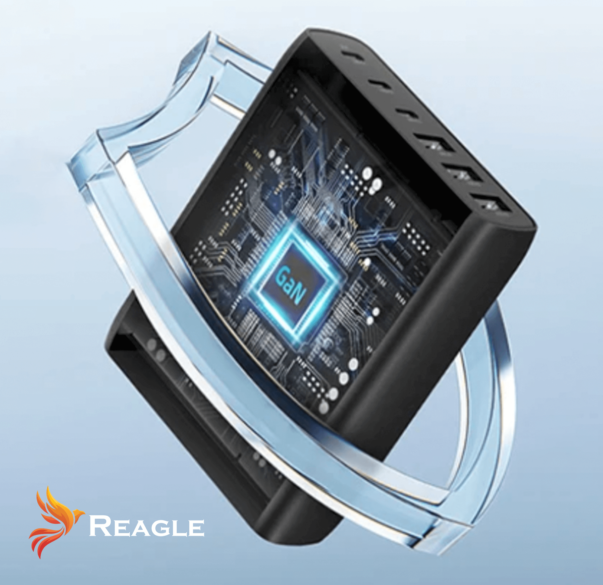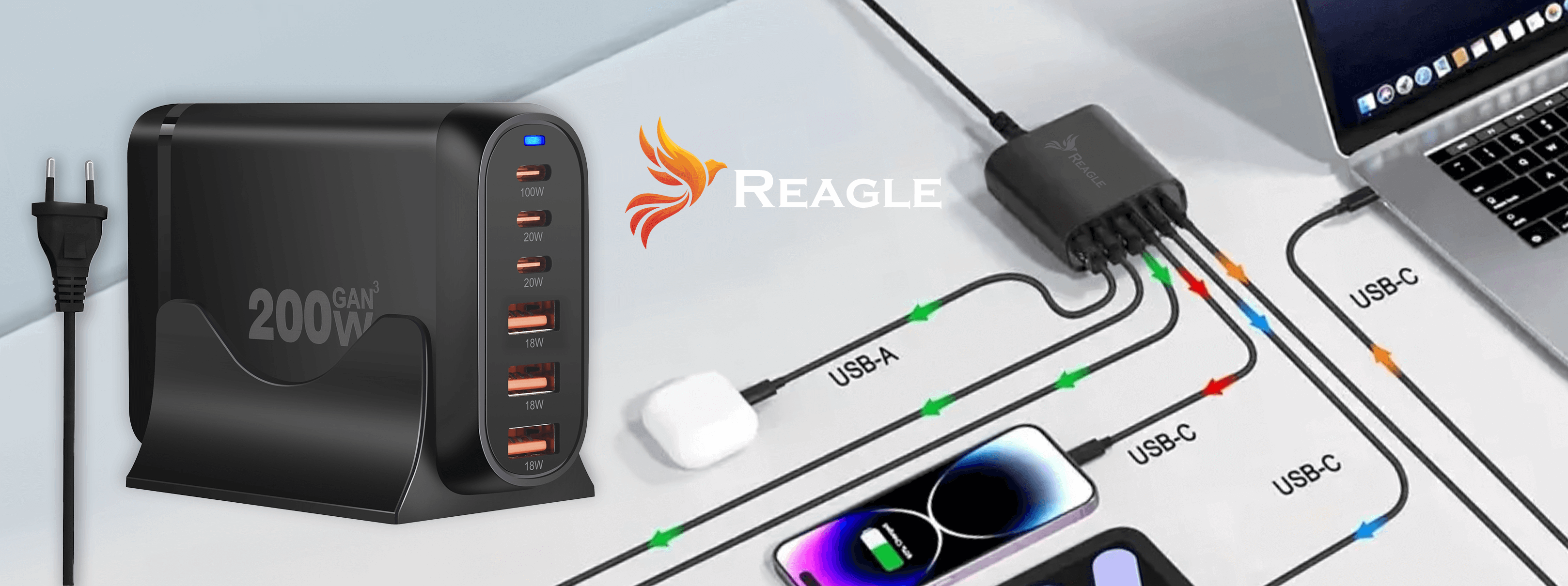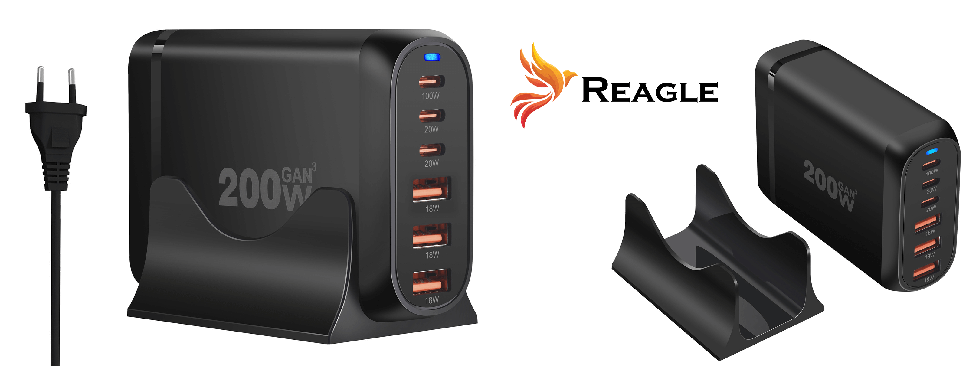 Reagle RCHAR91 to ładowarka sieciowa GaN o łącznej mocy 200W z trzema portami USB-C i trzema USB-A w zestawie z podstawką i zasilaczem 2.5A.