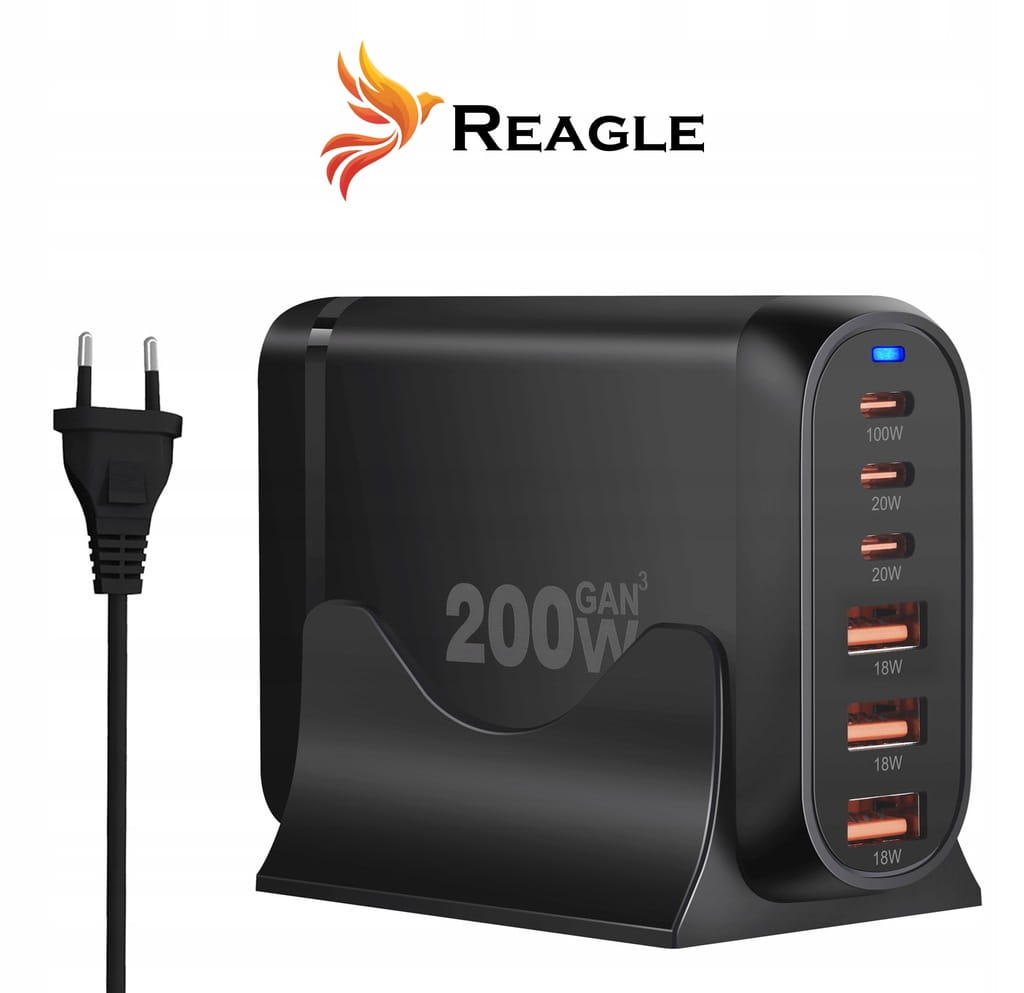 Reagle Szybka Ładowarka GaN 200W PD 3x USB C 3x Qc 3.0 Do Laptopa Iphone 100W Mac