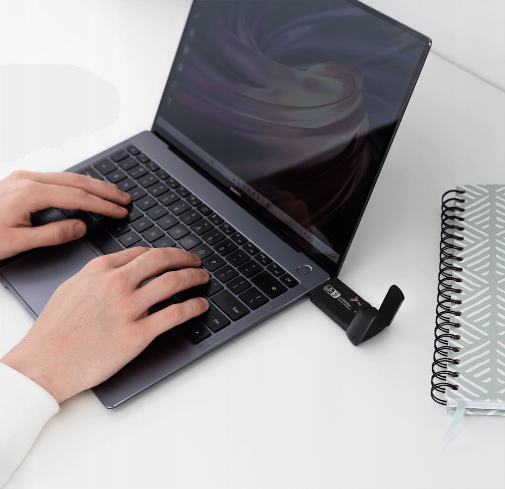 Adapter oferuje wsparcie dla sieci 2,4GHz i 5GHz, co pozwala na współpracę zarówno z nowym sprzętem oferującym szybszą transmisję za pomocą 5 GHz, jak i starszymi sprzętami ze standardem 2.4 GHz. Dwie anteny o mocy 5dBi gwarantują silne i stabilne połączenie nawet w trudnych warunkach, zapewniając płynną pracę i niezawodne połączenie bezprzewodowe.